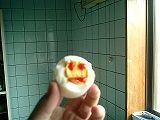 ゆでたまごにケチャップで顔を描いてみたら。おいしかったです。トマトケチャップの辛さと酸味が、ゆでたまごのもさもさ感をフォローする感じ。これからはゆでたまごはケチャップにします。2004-07-12