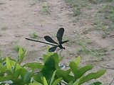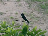 インターネットで検索してみました。オハグロトンボは、ハグロトンボとも言うそうです。ほうほう、「羽根が真っ黒・胴が金緑色」がオス、「羽根が濃褐色・胴が黒褐色」がメスだそうです。ということはこれはオスですね。