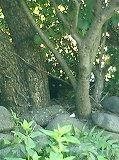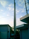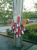 消防ホースが、鉄柱に吊り下げて干してありました。その下のほうを拡大した写真です。……なんだかイソギンチャクみたい。この鉄柱、8メートルぐらいかな、体育館の天井ぐらいの高さがあります。消防ホースってこうやって干すんですね。