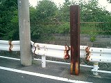 ガードレールが電柱と謎の鉄柱に沿って曲がっています。……思うのは「(電柱はともかく)どうしてガードレールが錆びた鉄柱に場所を譲らねばならないのか?」「この錆びた鉄柱に歴史的価値があるとでもいうのか?」疑問です。だいたい、ただ鉄を放置してもここまで見事に錆びないですよ。とすると、既に錆びたものをここに運んできて設置したんでしょうか。ますます謎です。