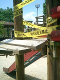 去年でしたか、今年の春先でしたか、公園の遊具で女の子が大怪我をした事故がありましたね。それの影響を受けてなのか、近所の公園の遊具が「立入禁止」のテープでぐるぐる巻きにされてました。なんだかもの悲しい風景です。立入禁止テープや立入禁止の看板、鉄条網、フェンス、非常階段、非常灯、工事現場のチューリップなどは……けっこう好きなんです。風景も好きだし、デザインも好きです。
