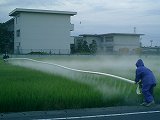 何をしているところかわかりますか? 都会育ちの人にはわからないでしょうね。これ、田んぼに農薬を撒いているところです。ホースを二人で持って、田んぼを横切る。一人がコンプレッサーを背負っており、ホースには農薬入りの空気が送り込まれている。ホースには穴がありそこから農薬が噴出される。そういう仕組みです。年に2回ほど見る光景です。