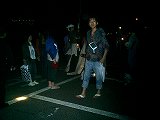 新生館の玄関に集合したときには、すっかり周囲は暗くなっていた。まだ6時台のはずだが、夏場とは違うのでもう夜中だ。二台のバスに分乗し、鳥取砂丘へと移動する。途中の車内では近しい席のもの同士、雑談が始まった。私は隣の高橋さん(だったと思う。間違ってたらごめんなさい。眼鏡をかけた青年)と話した。「いつから詩を書いているのか」「砂丘に行ったことはあるか」といった所から話していると、前の方が何やら騒がしくなってきた。大きな声でタスケさんが話し、花本武さんがフムフムと聞き役をしている。「女なんてぇ幾らでも次へ進めばいんだヨォ」「俺たちには時間がないんだぁ」などという宣言が(ほんわかした声で)熱っぽく飛ぶ。そのたびに車内の男どもが「おおおおおー!」と歓声を上げた(このバスには女性は二人しかいなかった。二人の心中、察して余りある。さぞかし不安でござったろう)。