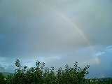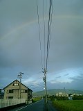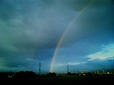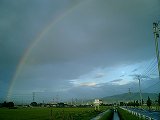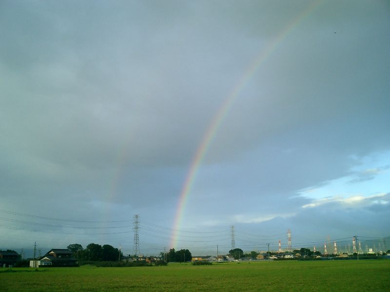 「副虹(ふくにじ)」という言葉を知っていますか。はっきり見える「主虹」の隣にうっすらと見える虹のことです。まれに見られる現象です。なんでも副虹の方が光の屈折回数が多いらしく、そのぶん薄く見えるんだそうです。この写真はその様子です。話には知っていましたが、実際に見たのは初めてでした。言われなければ気付かないぐらいの薄さです。主虹は180度くっきり出ていましたが、この服虹は端のほうに少しだけしか現れていませんでした。主虹に目を奪われていては気付けなかったでしょう。カメラを持ってきょろきょろしてたのが幸いしたんでしょうかねぇ。